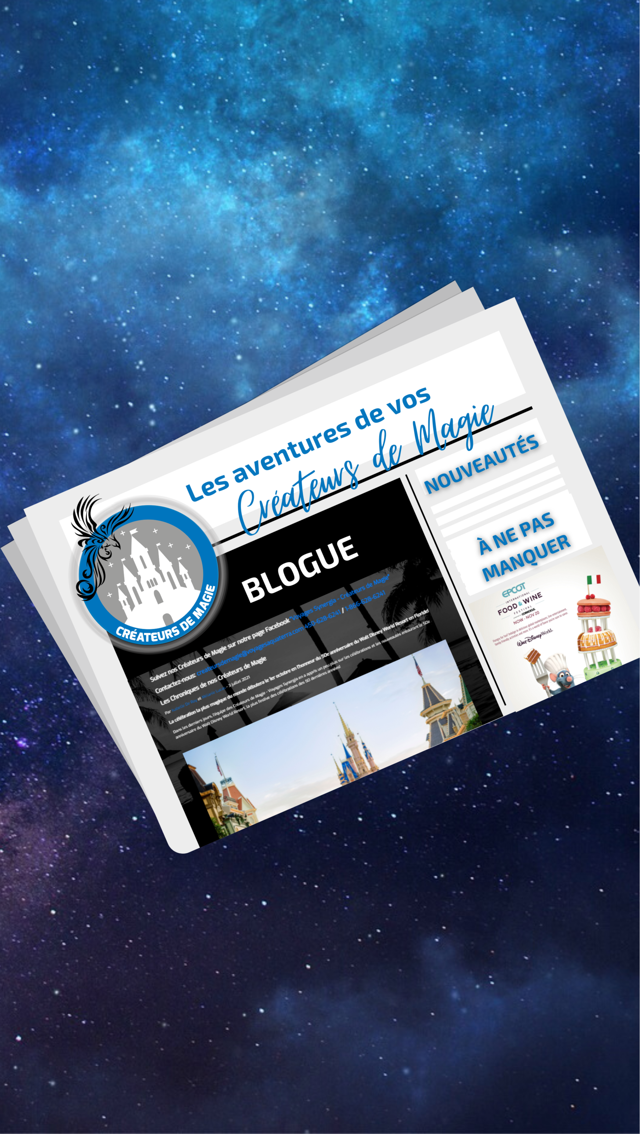 Suivez les "Nouvelles de nos Créateurs de Magie" qui vous feront découvrir tous les attraits et nouveautés de Walt Disney World Resort en Floride, de Disney Cruise Line, de Disneyland en Californie et à Paris, de Tokyo Disney Resort, de Adventures by Disney et du magnifique Aulani à Hawaii...